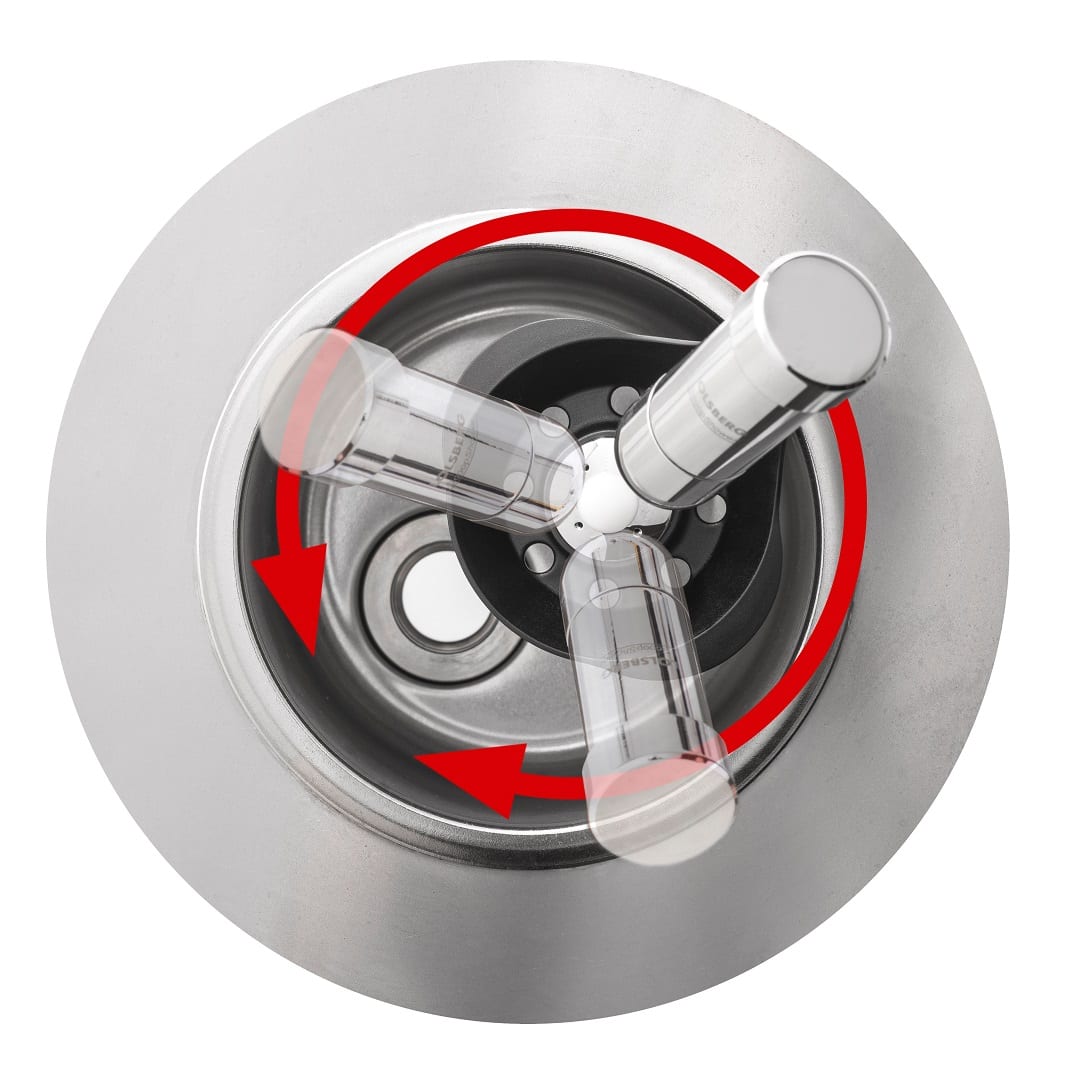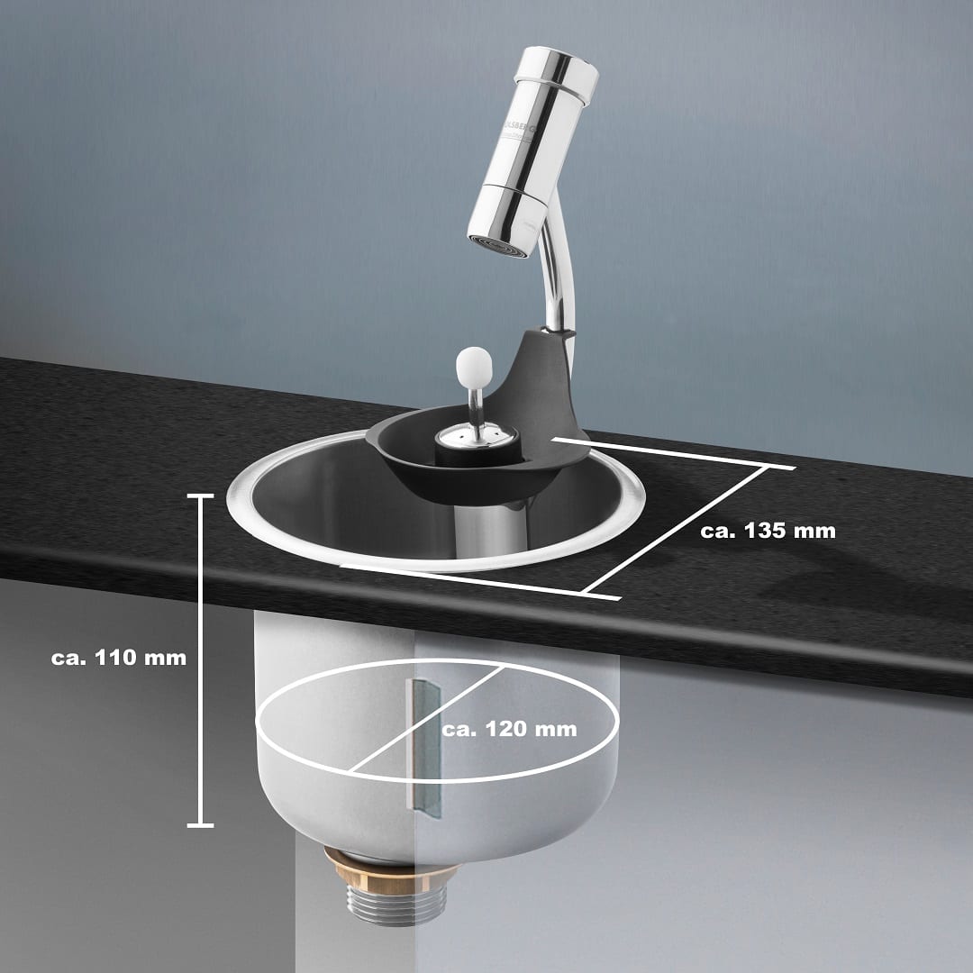 Save Water LogoSave Water – The water valves at the top and bottom are opened by pressing the scoop on the spherical head. The scoop is always rinsed with fresh water from above and below. Dirty washing water runs away immediately. The water on the inside of the scoop is swirled around. This rinses off the food residuals. On removing the scoop from the spherical head the water valves are automatically closed again by the water pressure.