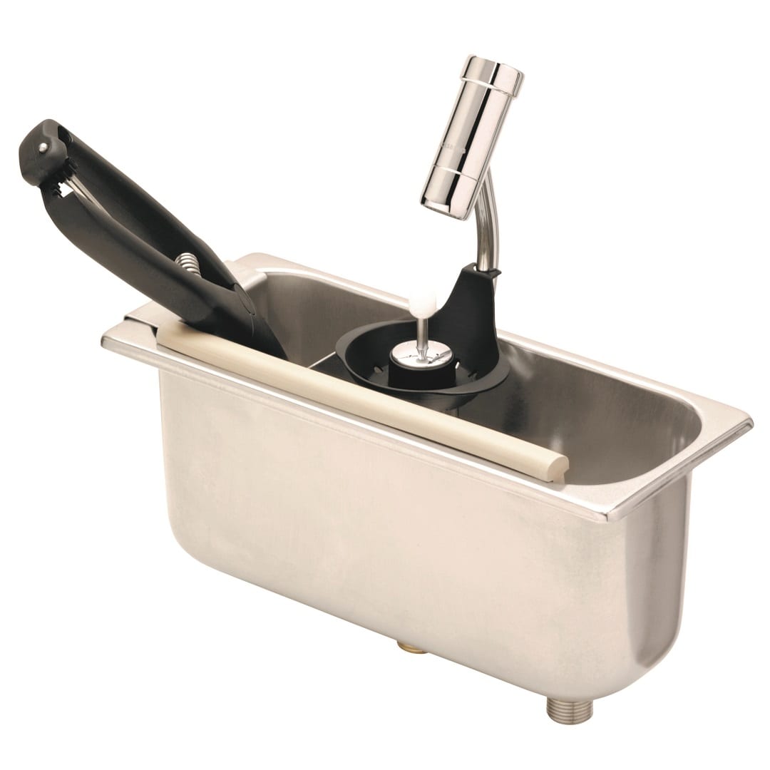 Removable scoop drain insert –Ā The scoop drain insert can be easily clipped into the rinsing containers and serves as a clean drip drain area for rinsed scoops while keeping sufficient distance from the bottom of the rinsing container. This allows air to circulate, reducing bacterial growth, maximising hygiene.