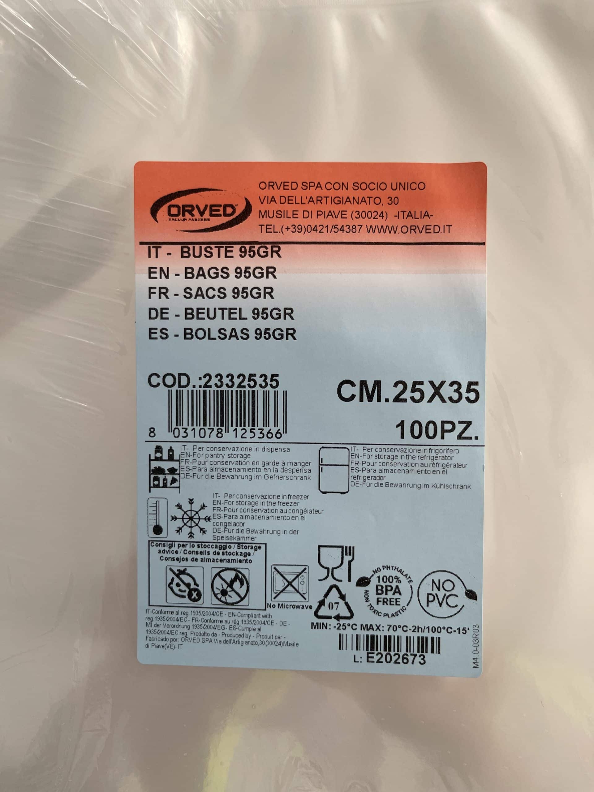 Orved have been manufacturing its own line of smooth Vacuum Bags for 12 years. A great deal of time has gone into research and development of innovative materials which could meet the most sophisticated requirements of Sous-Vide technology.
