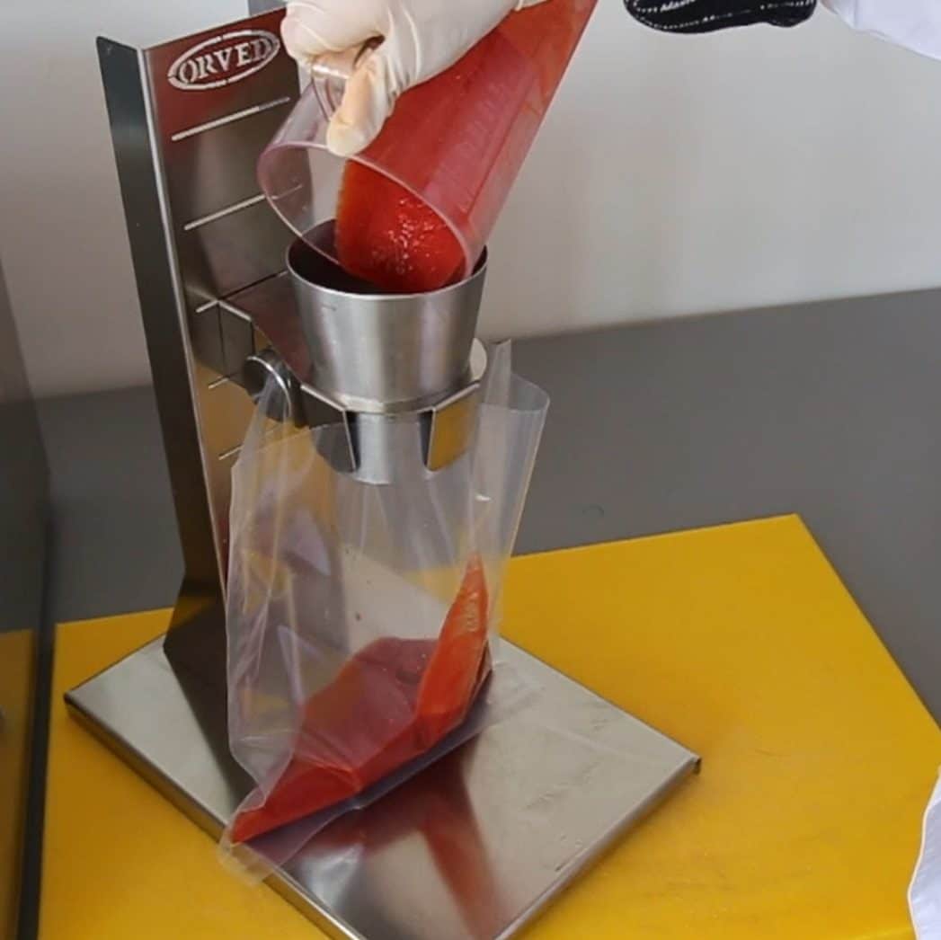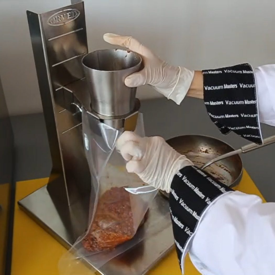 Stainless Steel Funnel for filling vac pack bags The vac pack bag filling funnel makes loading bags easy and ensures any product is kept away from the edge of the bag ensuring a strong seal every time. Stainless steel funnel with adjustable height and area suitable for placing weighing scales. Orved PN: 1601885