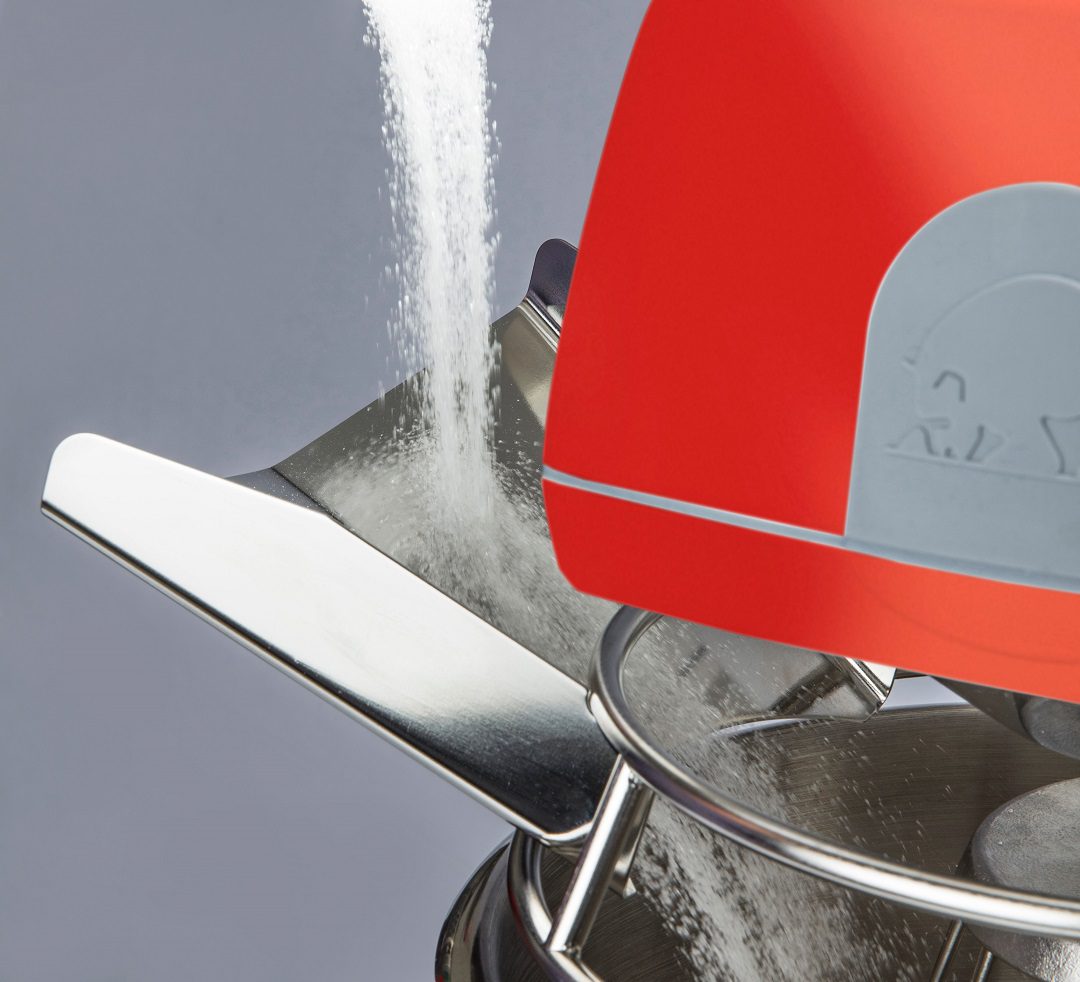 The Varimixer Teddy is low-noise, with the same kind of sounds of quality we associate with an expensive car, where the motor purrs and the doors shut with conviction. It makes the right sounds when you turn up the speed, and when you press the click-lock to tilt back the mixer head.